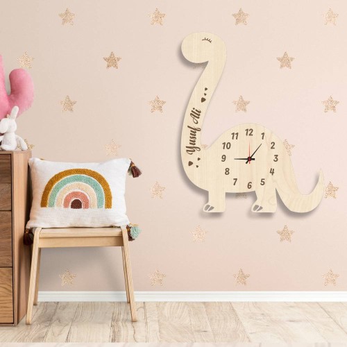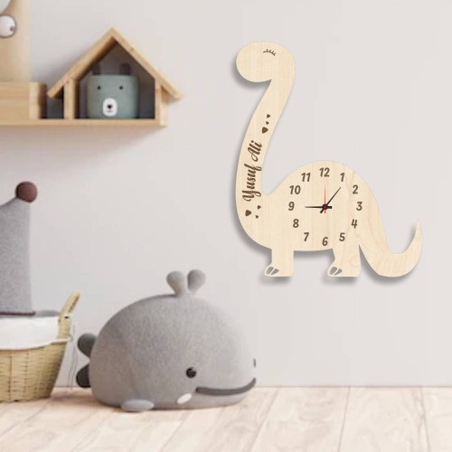 Mutlu Dinozor Çocuk Odası Duvar Saati erkek çocuk odası, kız çocuk odası, bebek odası dekorasyonuna özel olarak tasarlanmış isme özel çocukların çok seveceği bir duvar saatidir. 3mm ahşap desen mdf ile hazırlanmaktadır. Sessiz mekanizmalıdır ve oda için sesi duyulmaz.