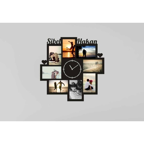 - Kişiye Özel Saatli Fotoğraf Çerçevesi isimlerinizin yazdığı, sevdiğiniz fotoğrafları sergileyebileceğiniz hem bir çerçeve hem de resimli duvar saatidir. Bu ürün ile saate her baktığınızda dijital ortamda gözümüzden kaybolan sevdiğimiz fotoğrafları her an karşınızda göreceksiniz. 50x50cm boyutundadır . 5mm siyah mdf ile üretilmektedir. Laser Cnc Kesim ile isimleriniz saat üzerine yazılmaktadır. 15×10 resimleriniz için uygundur. Ürünün arkasında askı aparatı vardır.