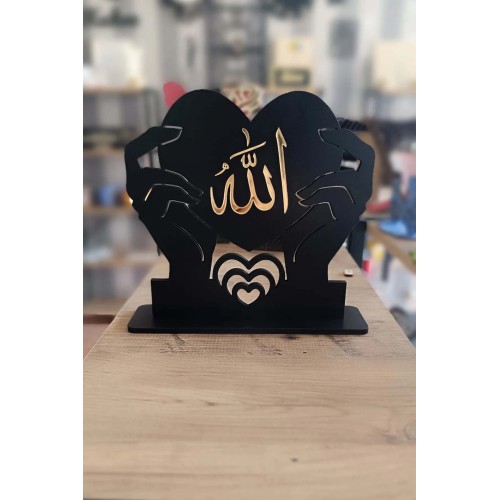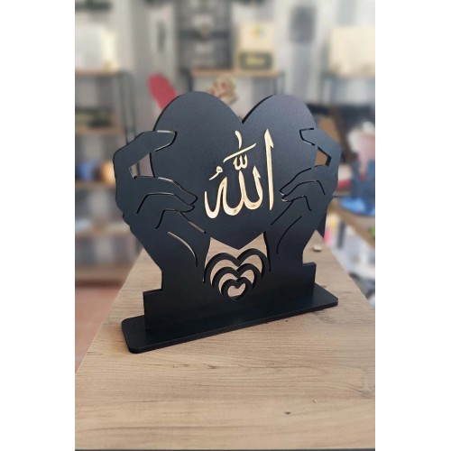 Allah Yazılı İslami Dekoratif Ayaklı Çerçeve, evinizin dekorasyonuna zarafet ve manevi bir hava katacak şekilde tasarlanmış özel bir üründür. Bu çerçeve, 3mm kalınlığındaki siyah MDF malzemeden lazer kesim tekniği ile özenle hazırlanmıştır. 25 x 25 cm boyutlarında olan bu dekoratif çerçeve, hem masaüstünde sergilenebilecek hem de duvara asılabilecek şekilde tasarlanmıştır.