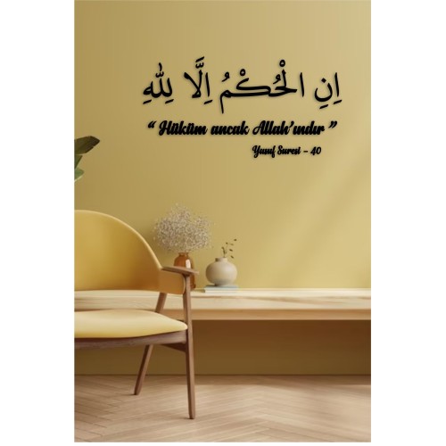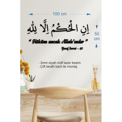 Hüküm Ancak Allah’ındı Ayeti Duvar Yazısı ev veya iş yerlerini İslamî motiflerle dekore etmek isteyenler için harika bir seçimdir. Ürünümüz, 3mm siyah mdfden lazer kesim ile hazırlanmaktadır. Duvarda kapladığı alan:Genişlik 100cm yükseklik 50cm Resimde görülen arapça harf ve harekeler ayrı ayrı parçalardır. Ürünün yanında gönderilecek olan çift taraflı silikon bantı, her parçanın arkasına taktıktan sonra tasarımdaki gibi duvara monte edebilirsiniz. Bu ürün, evine manevi bir hava katmak isteyenler için mükemmel bir seçenek ve hediye olabilir.